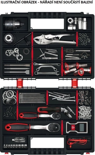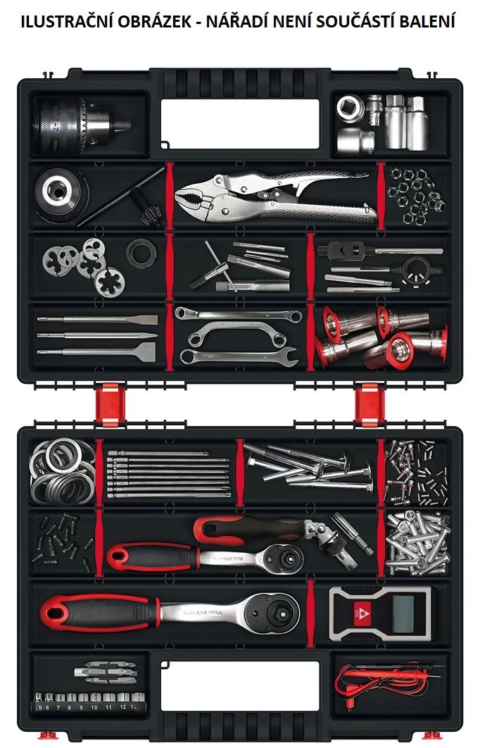 Průhledné víko šetří čas – vše vidíte na první pohled bez otevírání. Odolný plast chrání uložený materiál, pevné zámky udrží obsah na místě i při přenášení a ergonomické držadlo zaručí pohodlnou manipulaci. Kompaktní rozměry se hodí do dílny, servisního vozu i domácí garáže.