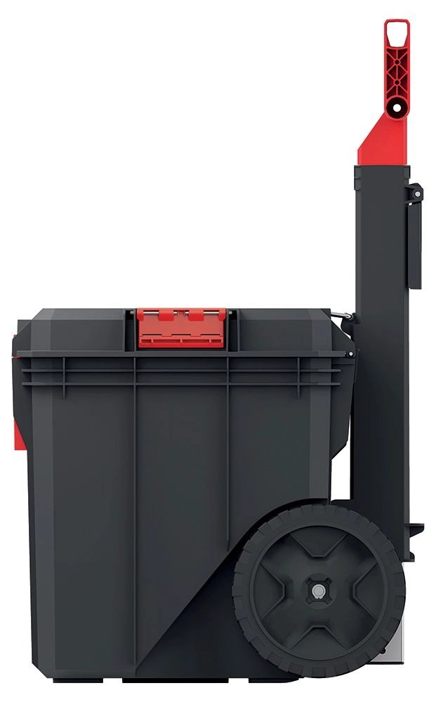 Velká, odolná kola a výsuvné madlo umožňují pohodlný přesun i plně naloženého kufru po dílně, stavbě či nerovném povrchu.