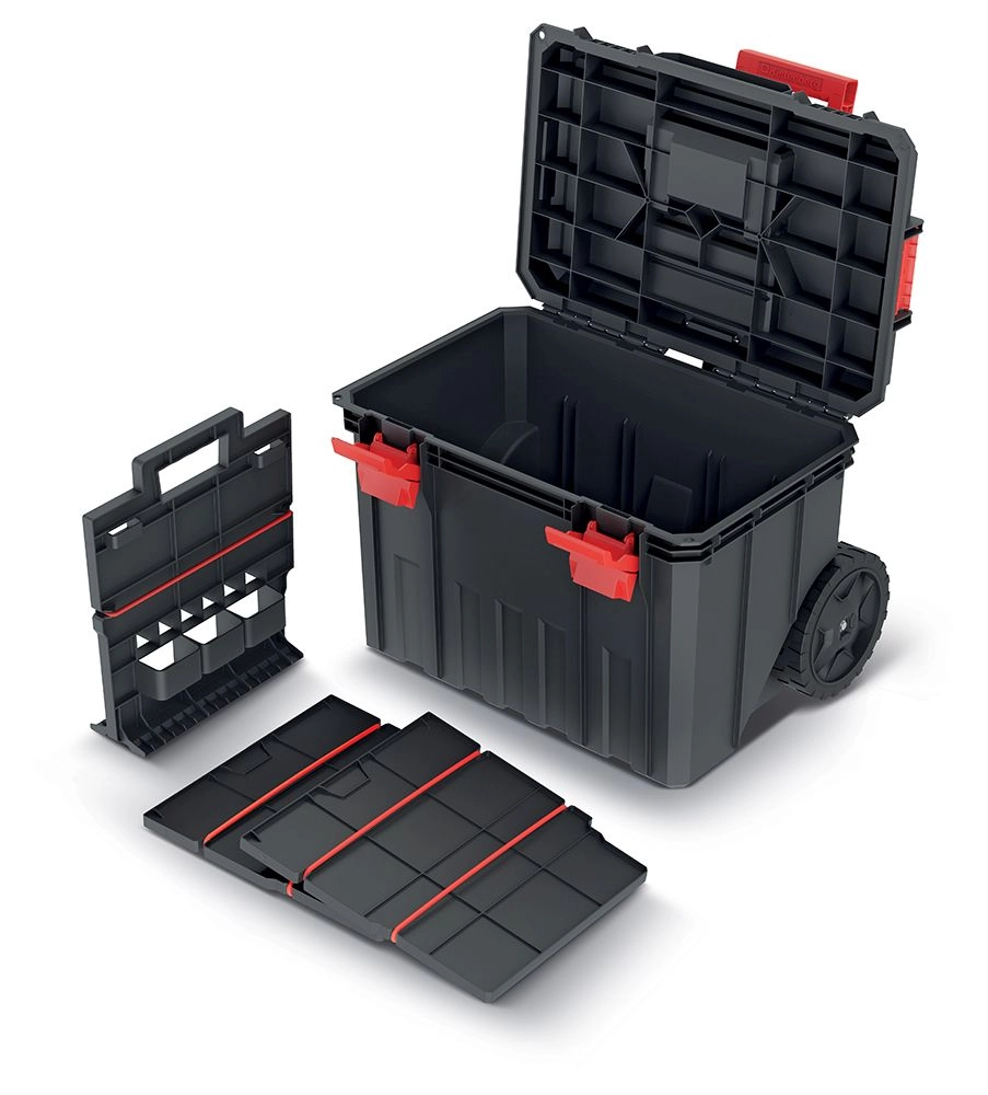 Kufr na nářadí s rozměry 530 × 355 × 390 mm je navržen pro každodenní nasazení na stavbě, v dílně i v garáži. Velká kolečka, teleskopické madlo a pevné horní držadlo zajišťují pohodlné a bezpečné manévrování, zatímco robustní plast odolává nárazům a drsným podmínkám.