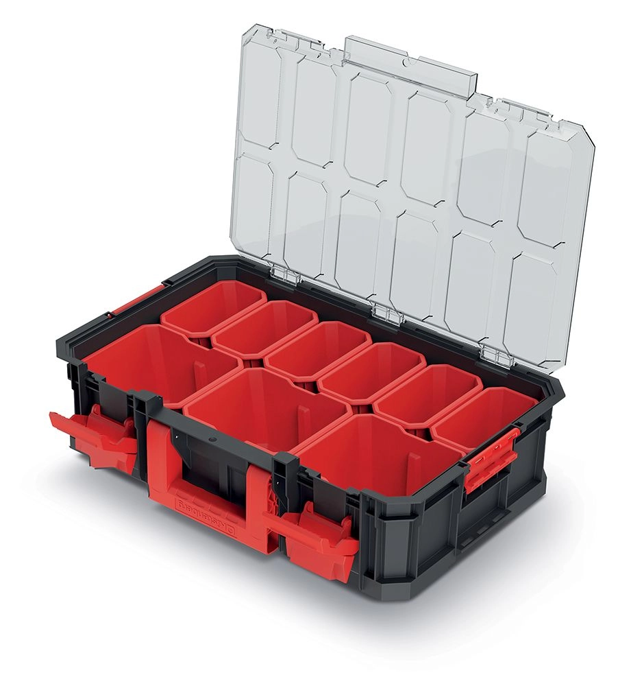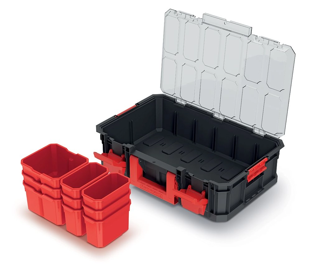 Transparentní víko zajišťuje okamžitý vizuální přehled o obsahu. Díky pevným západkám a bočním klipům zůstává vše bezpečně uzavřeno i při přenášení.