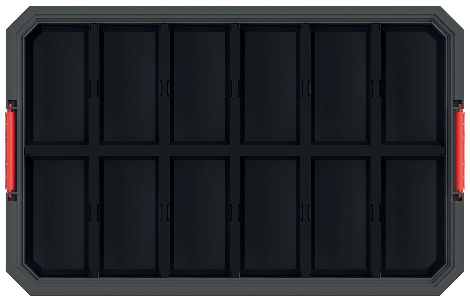 Upravte si vnitřek boxu přesně podle povahy uloženého materiálu. Mřížkované členění a přepážky udrží šroubky, bity i drobné díly přehledně oddělené.
