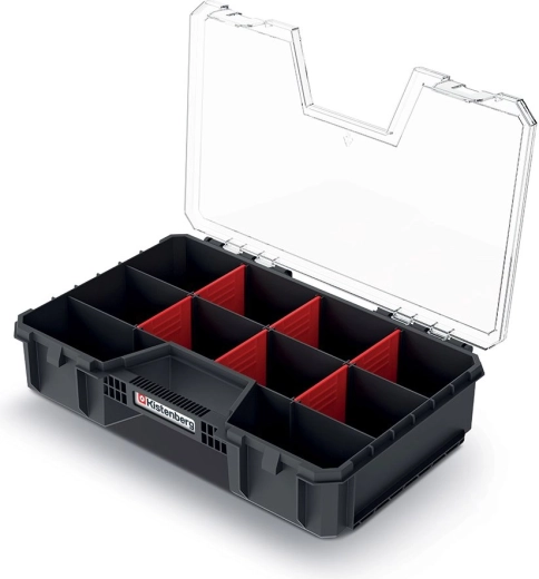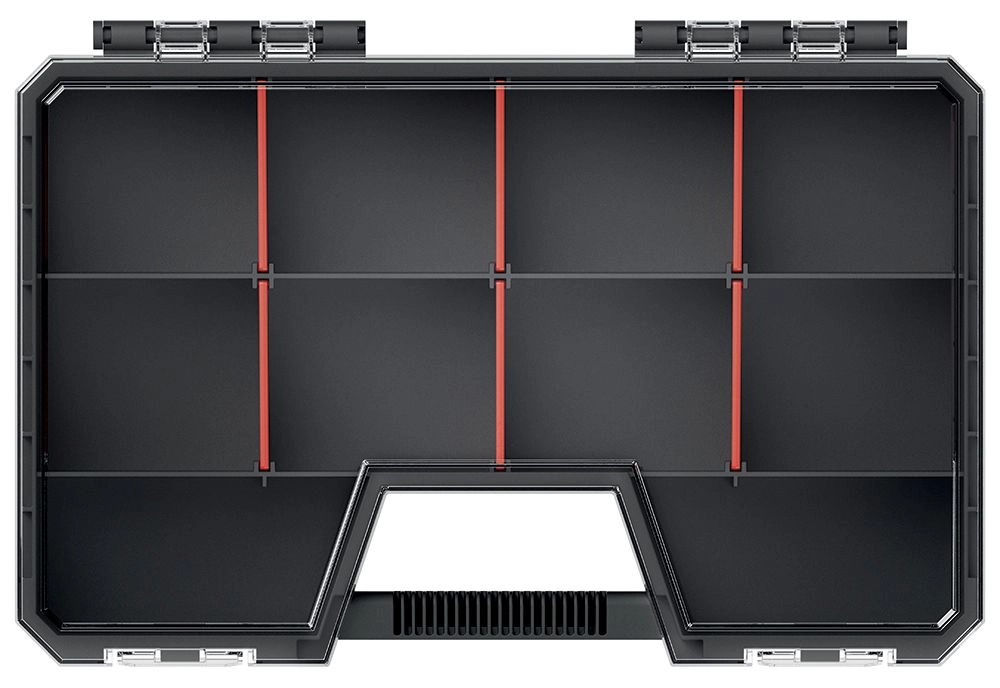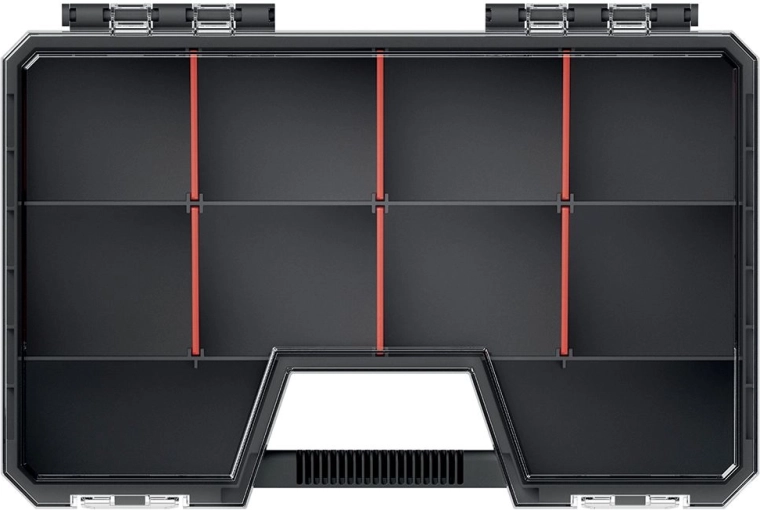 Díky vyjímatelným červeným přepážkám si snadno přizpůsobíte vnitřní členění přesně podle aktuálních potřeb – od šroubků a hmoždinek, přes elektronické komponenty až po dílky stavebnic LEGO. Lehká a odolná konstrukce z kvalitního plastu zaručuje dlouhou životnost a pohodlné přenášení.