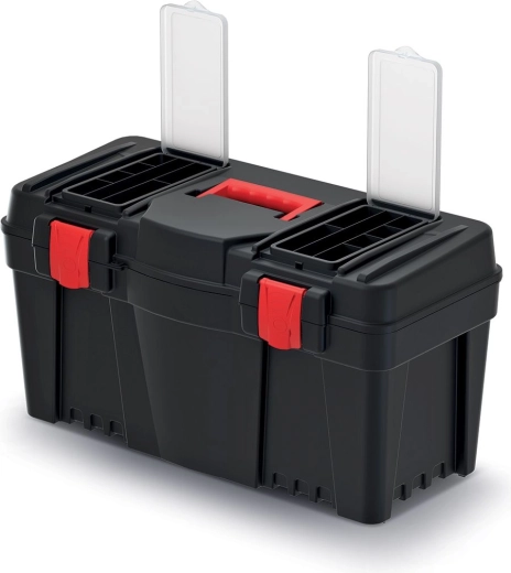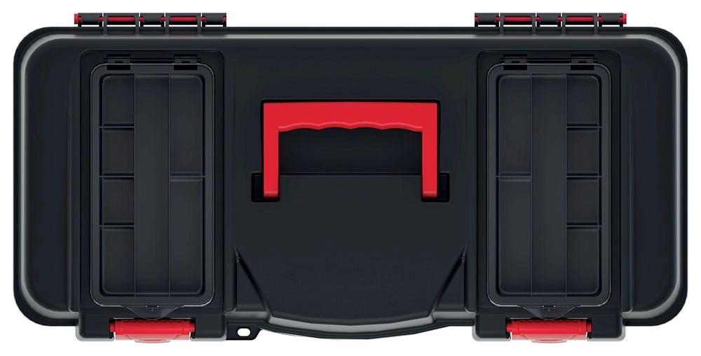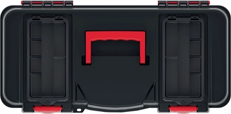 Chytré vnitřní uspořádání zahrnuje vyjímatelnou přenosnou přihrádku pro často používané nástroje a prostorný hlavní box pro větší vybavení. Dva horní organizéry s průhlednými víčky umožňují rychlý přístup k drobnému spojovacímu materiálu, šroubkům či bitům bez nutnosti otevírat celý kufr.