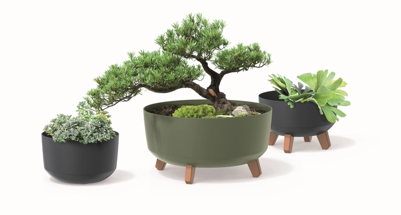 Krátké nožky s dekorem dřeva zvedají nádobu nad povrch, čímž podporují proudění vzduchu a přispívají k zdravějšímu prostředí pro kořeny.