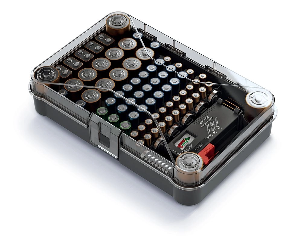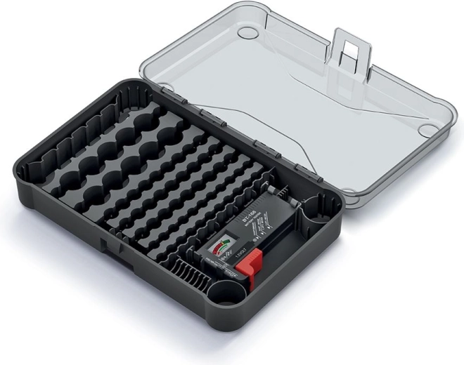 Praktický box na baterie s průhledným víkem nabízí jasný přehled o AA, AAA, C, D i 9V článcích, které uložíte do vyhrazených přihrádek. Integrovaný analogový tester umožní během chvilky ověřit zbývající kapacitu, takže budete vždy vědět, které baterie jsou připravené k použití.