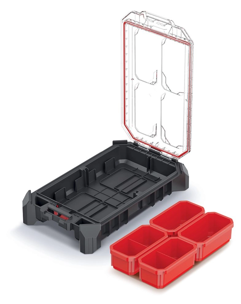 Víko z odolného polykarbonátu umožňuje zkontrolovat obsah jedním pohledem bez nutnosti organizér otevírat. Šetří čas při práci i na cestách.