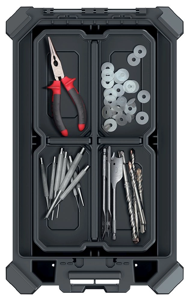 Díky vyjímatelným přepážkám si snadno přizpůsobíte vnitřní prostor svým potřebám. Modulární konstrukce je ideální pro profesionály i hobby uživatele – organizér lze propojit s dalšími prvky série MSX a vytvořit tak ucelený, přenosný a rozšiřitelný systém ukládání.