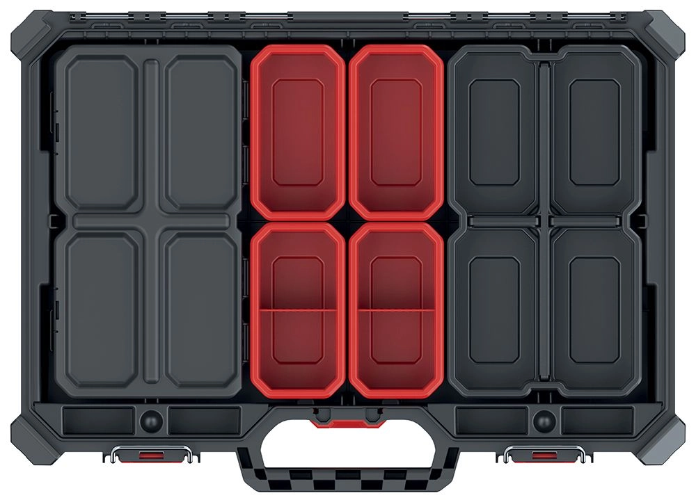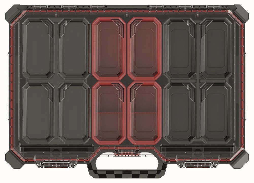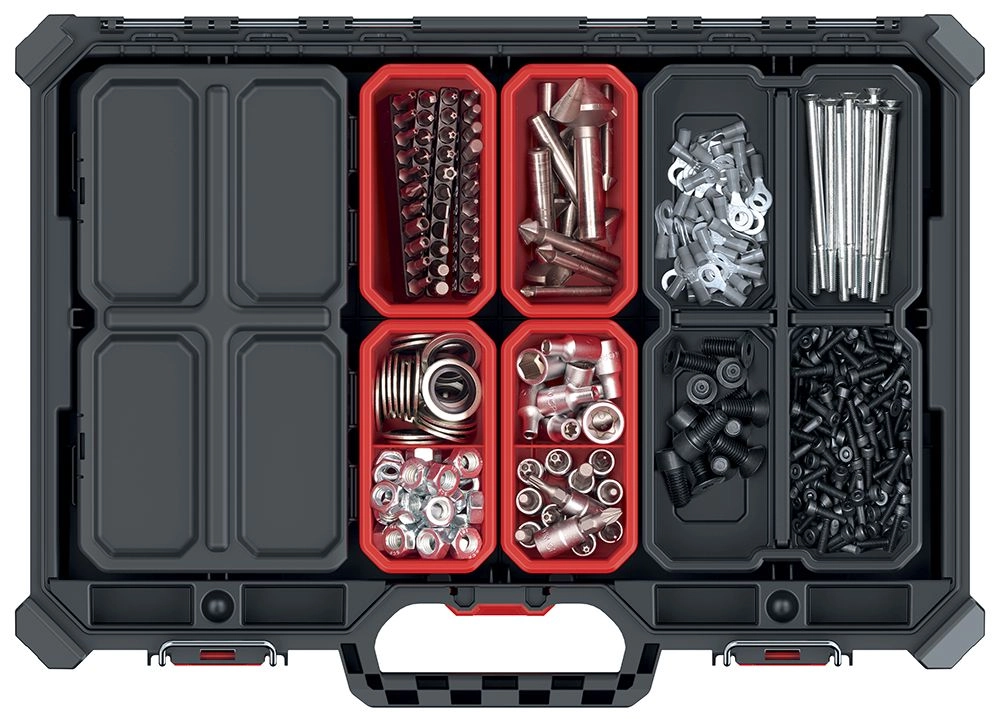 Díky 7 vyjímatelným boxům a 3 přepážkám si snadno přizpůsobíte vnitřní uspořádání aktuálním potřebám. Kovové panty a spony z ABS s kovem drží víko pevně uzavřené, zatímco těsnění proti prachu a vodě chrání obsah během přepravy i práce v prašném nebo vlhkém prostředí. Organizér lze propojit v systému X BLOCK díky zámkovému mechanismu pro pohodlné stohování a přenášení.