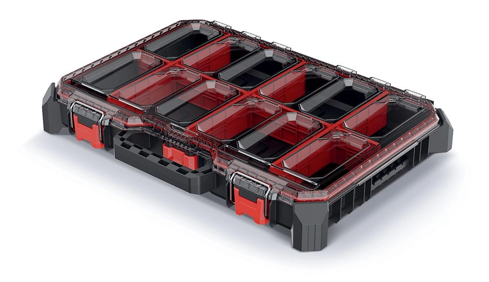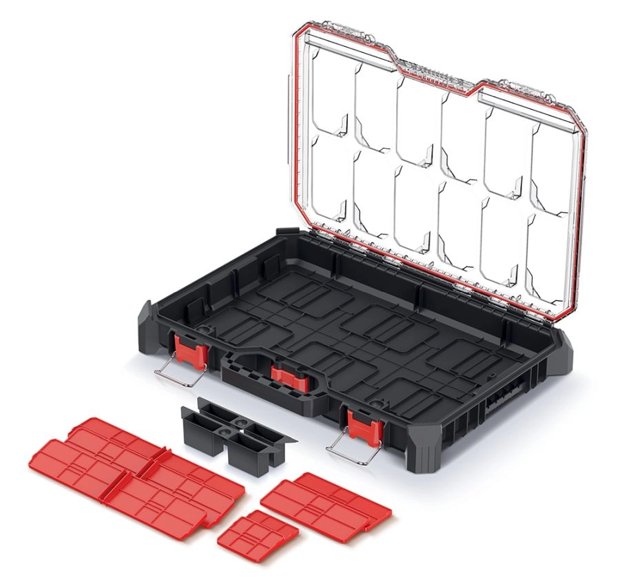 Odolný organizér na nářadí a spojovací materiál s nízkým profilem pro snadné skladování. Nabízí průhledné polykarbonátové víko pro rychlý přehled, pevné těsnění proti prachu a vlhkosti a kovové panty s ABS západkami pro bezpečné uzavření. Díky 2 vyjímatelným boxům a 7 přepážkám si vnitřní prostor přizpůsobíte přesně svým potřebám.