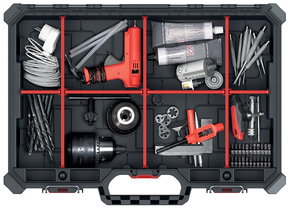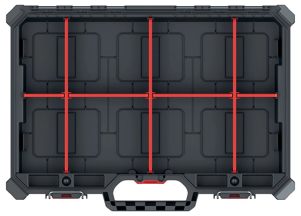 Díky nízkému profilu a pevnému madlu se organizér snadno přenáší a skládá do regálů či do auta. Kovové panty, ABS západky a těsnění po obvodu spolehlivě chrání uložené šrouby, hmoždinky či bity před prachem a vlhkostí.