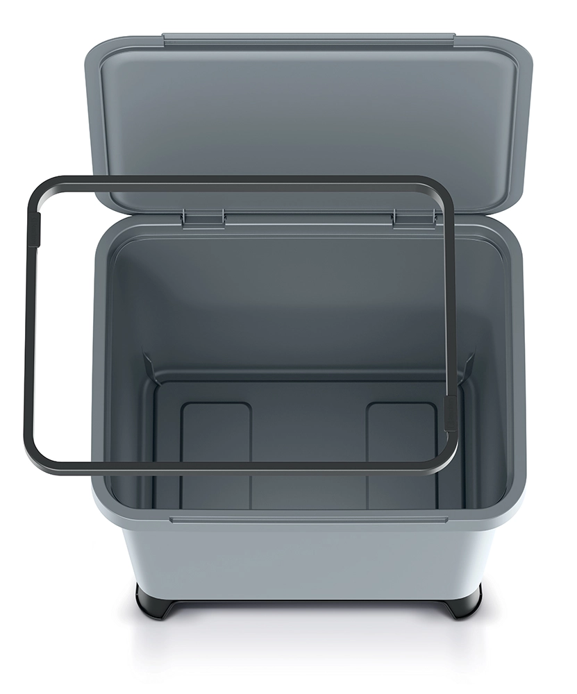 Praktický vnitřní rámeček spolehlivě drží sáček na odpad na místě, takže se nesesouvá dovnitř. Zvýšená základna/nožky zlepšují stabilitu, umožňují proudění vzduchu a usnadňují úklid pod košem. Hladký povrch se snadno čistí a odolává skvrnám.