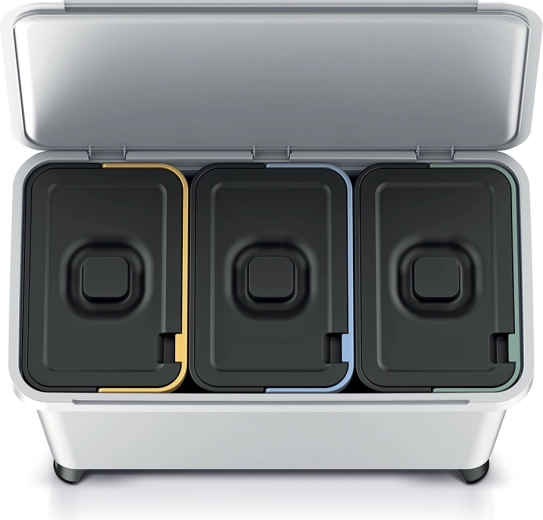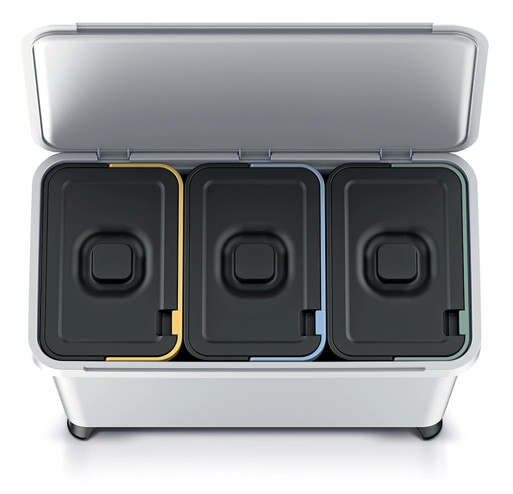 Tři vyjímatelné vnitřní koše po 10 l s barevně označenými víky urychlí třídění a udrží pořádek na jednom místě.