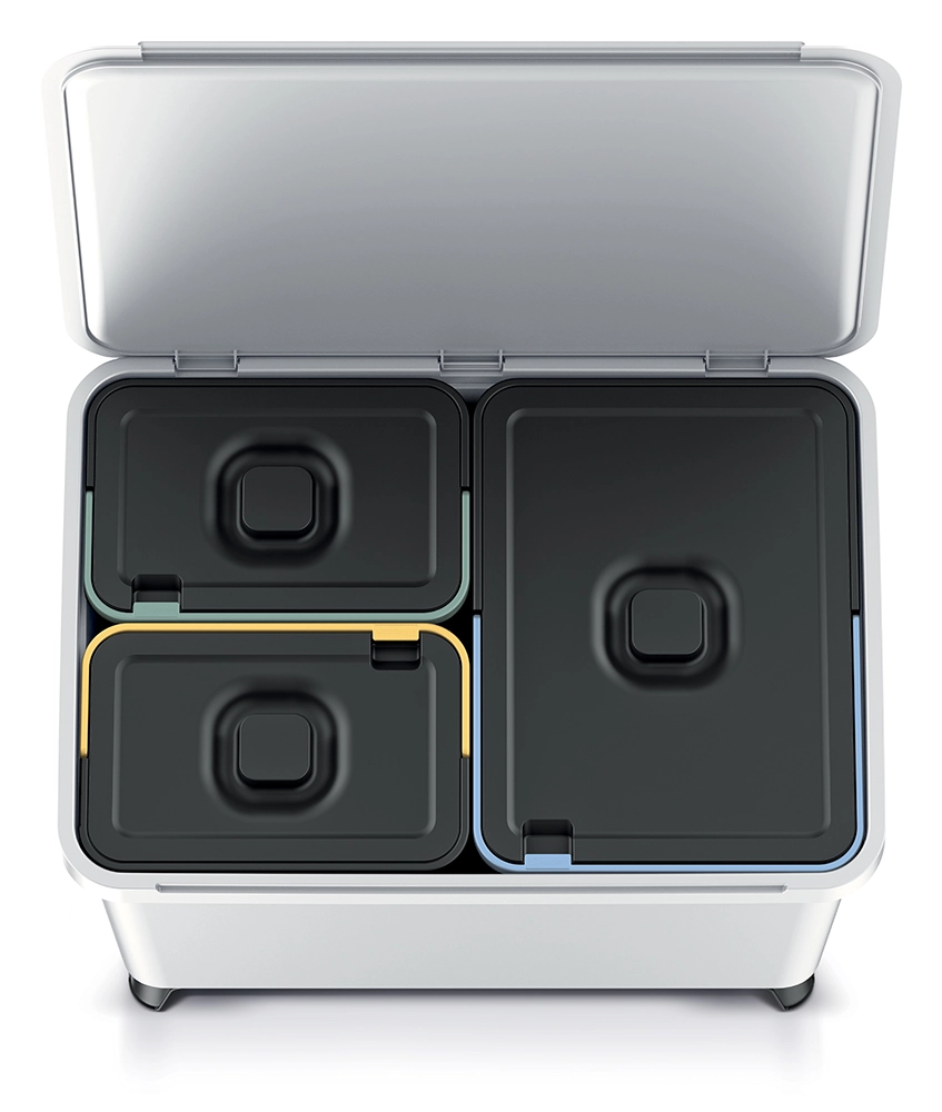Elegantní, popelavě šedý koš na tříděný odpad PROSPERPLAST Systema kombinuje funkčnost a prostorovou flexibilitu. Tři vyjímatelné nádoby s barevným značením poskytují dostatek místa pro každodenní odpad a přehledné třídění bez kompromisů.