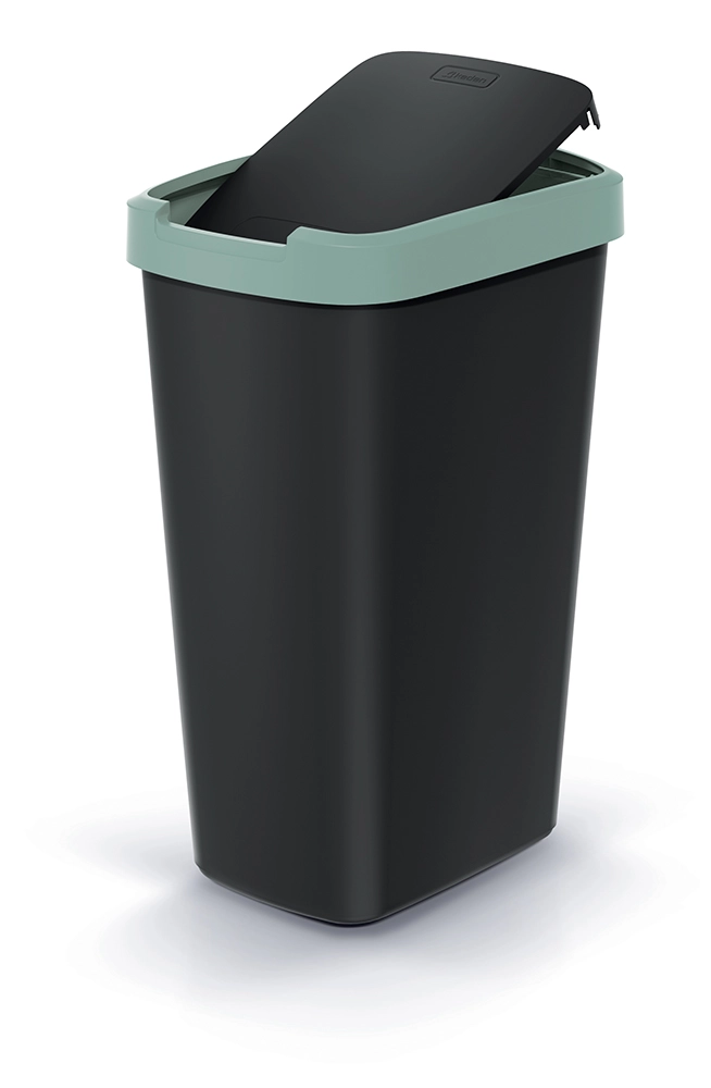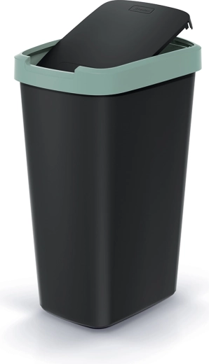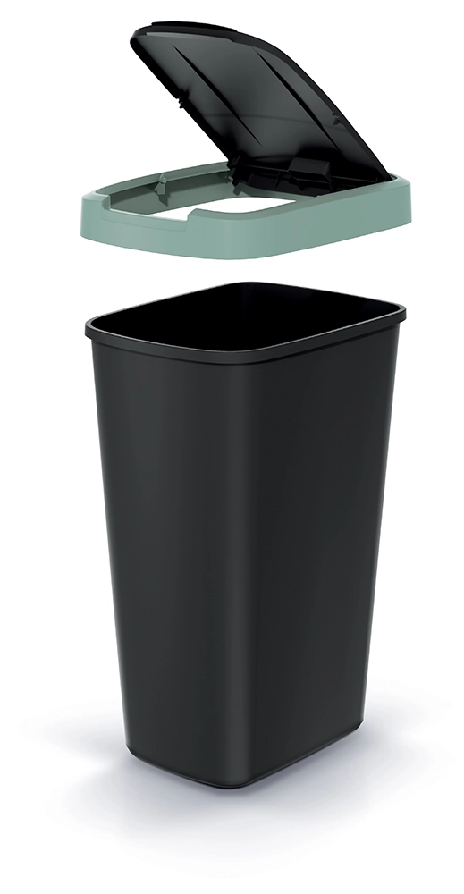 Elegantní a prostorově úsporný koš s objemem 45 litrů je ideální volbou pro kuchyň, kancelář i menší prostory. Tělo z odolného plastu v matné černé barvě doplňuje decentní světle zelený lem, který dodává moderní vzhled a usnadňuje sladění s interiérem.