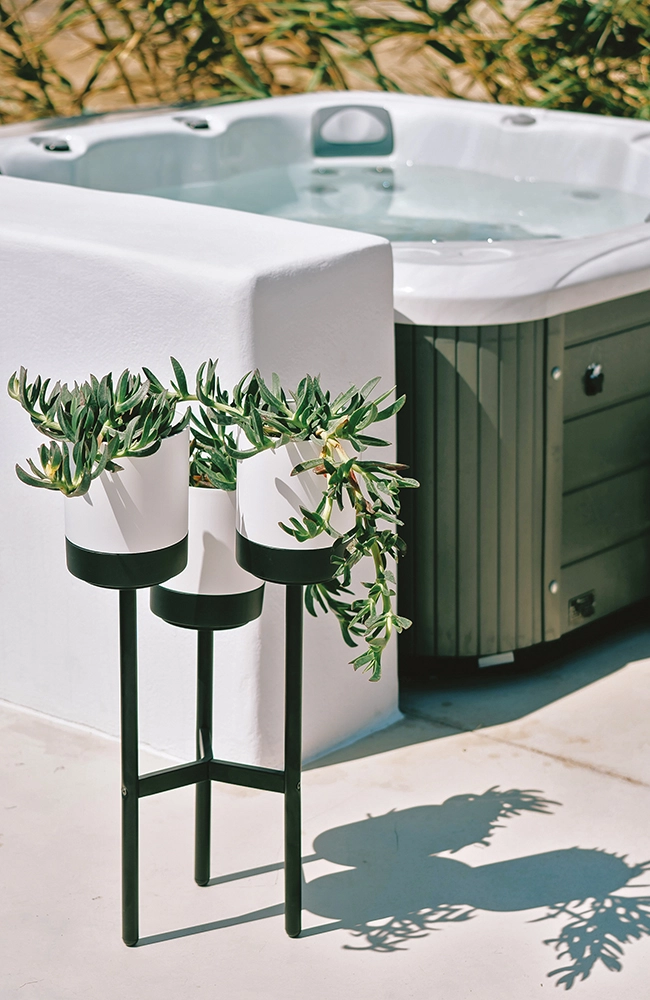 Tři květináče v odlišných výškách zvýrazní tvar i barvy každé rostliny a vytvoří dynamickou kompozici, která upoutá pozornost.