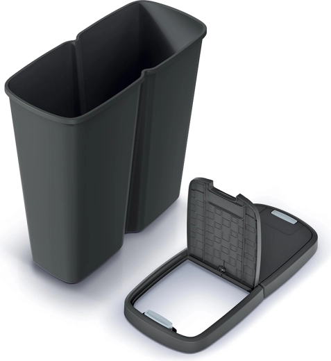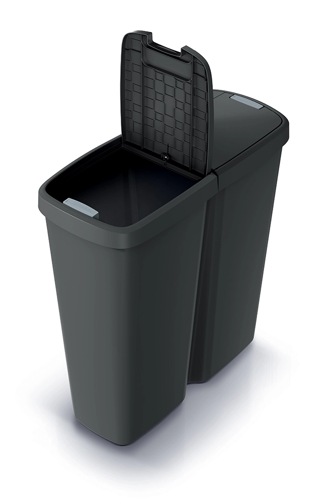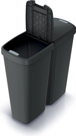 Praktický odpadkový koš PROSPERPLAST COMPACTA Q DUO s objemem 50 l je ideální pro efektivní třídění odpadu v domácnosti i kanceláři. Nabízí dvojité víko s tlačítkovým otevíráním a chytré uchycení jednoho nebo dvou pytlů, takže snadno oddělíte smíšený odpad, plast či papír. Je vyroben z recyklovaného plastu, má kompaktní rozměry pro úsporu místa a elegantní černý design.