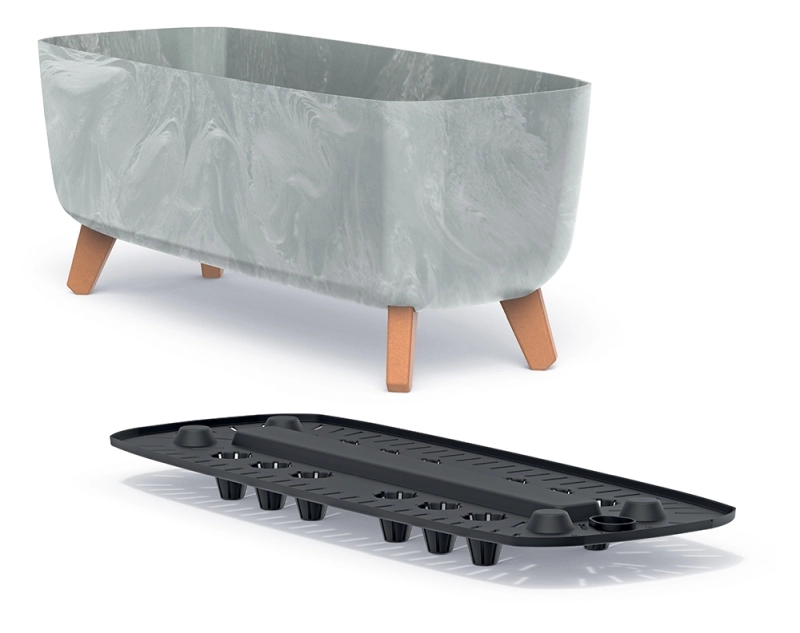 Díky vyvýšeným nožičkám s dřevěným efektem lépe proudí vzduch pod nádobou a minimalizuje se riziko přemokření. Hranatý tvar nabízí dostatek prostoru pro kořenový systém a působí úhledně na okenním parapetu, polici i venkovním stolku.