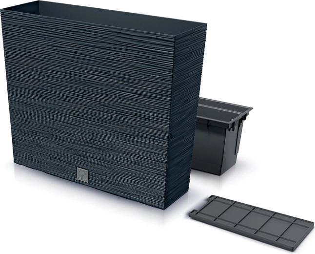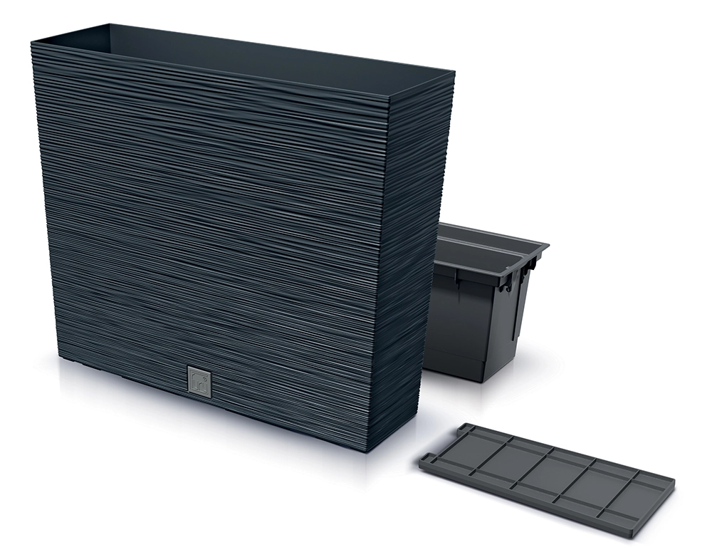 Součástí je vyjímatelná vnitřní vložka (12 l) s podmiskou pro efektivní odvodnění a snadnou manipulaci při výsadbě. Samozavlažovací systém udržuje stabilní vlhkost substrátu, což prospívá květinám, bylinkám i menším okrasným travinám.