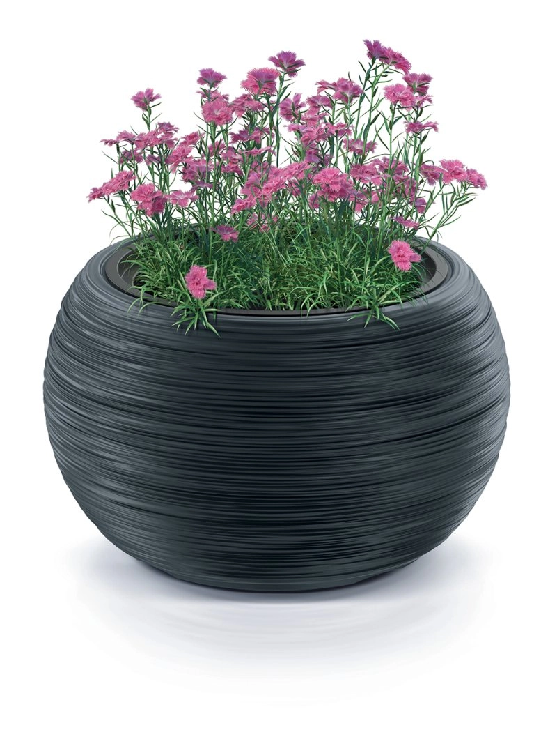 Horizontální textura a kulatý tvar dodají rostlinám stylovou prezentaci. Světle šedý odstín se snadno kombinuje s nábytkem i exteriérovými doplňky.