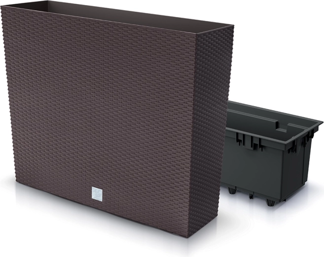 Elegantní vysoký truhlík s vložkou Rato Case o délce 58 cm v antracitové barvě je ideální pro interiér i exteriér. Kombinuje věrnou imitaci ratanového výpletu s odolnou plastovou konstrukcí, která zvládá UV záření, povětrnostní vlivy i mráz. Součástí je černá vložka pro snadné zasazení, která usnadňuje údržbu a podporuje zdravý růst rostlin.