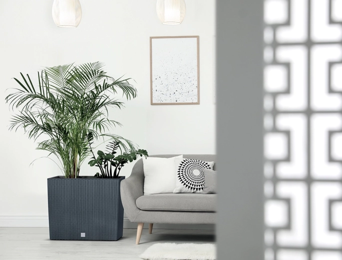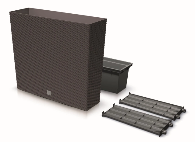 Vysoký truhlík s věrnou imitací ratanového výpletu dodá vašemu prostoru moderní a čistý vzhled. Kvalitní plast zajišťuje dlouhou životnost, stálost barev a odolnost vůči UV záření i proměnlivému počasí. Díky štíhlému profilu šetří místo a je ideální pro bylinky, květiny i okrasné traviny.