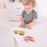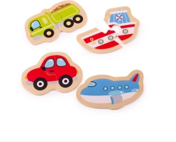 Tato sada dřevěných puzzlí přináší čtyři oblíbené dopravní prostředky, které děti snadno složí ze dvou pevných dílků. Jednoduché tvary, výrazné barvy a příjemné dřevěné provedení lákají k opakovanému hraní a přirozeně podporují rozvoj řeči, rozpoznávání tvarů a barev i soustředění.
