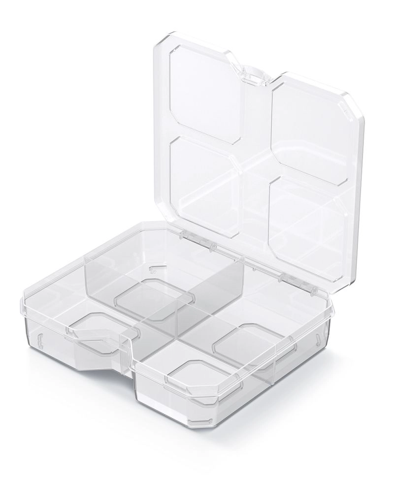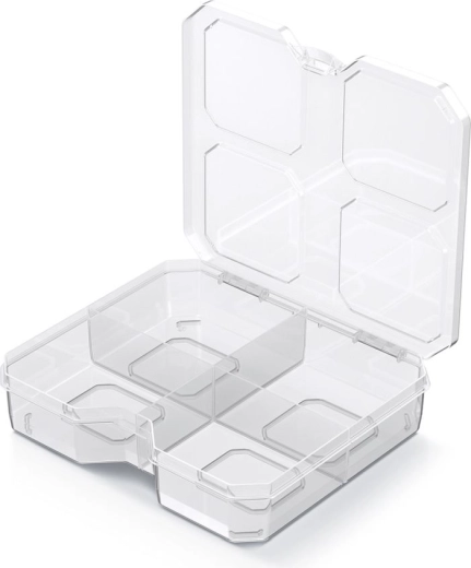 Praktický a lehký organizér SQR box je ideální pro ukládání drobných součástek, jako jsou šroubky, matice či hřebíky. Nabízí 4 pevné přihrádky pro přehledné třídění a transparentní víko pro rychlou vizuální kontrolu obsahu. Díky kompaktním rozměrům se snadno vejde do kufru na nářadí, brašny nebo skříňky a jeho odolný plast zaručuje dlouhou životnost.