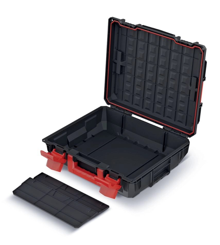 Promyšlené vnitřní uspořádání zahrnuje 2 odnímatelné přihrádky pro drobné příslušenství a prostorný hlavní oddíl pro větší nástroje. Díky modulární konstrukci lze úložný prostor snadno rozšířit a přizpůsobit aktuálním potřebám. Nízká hmotnost a kompaktní rozměry zajišťují pohodlné přenášení.
