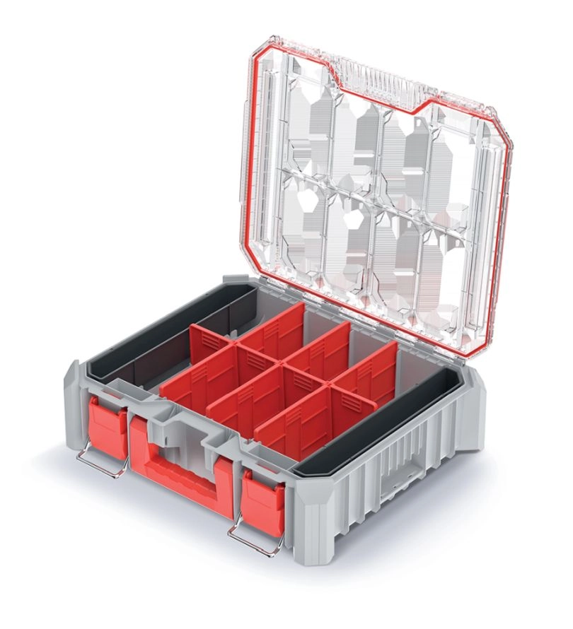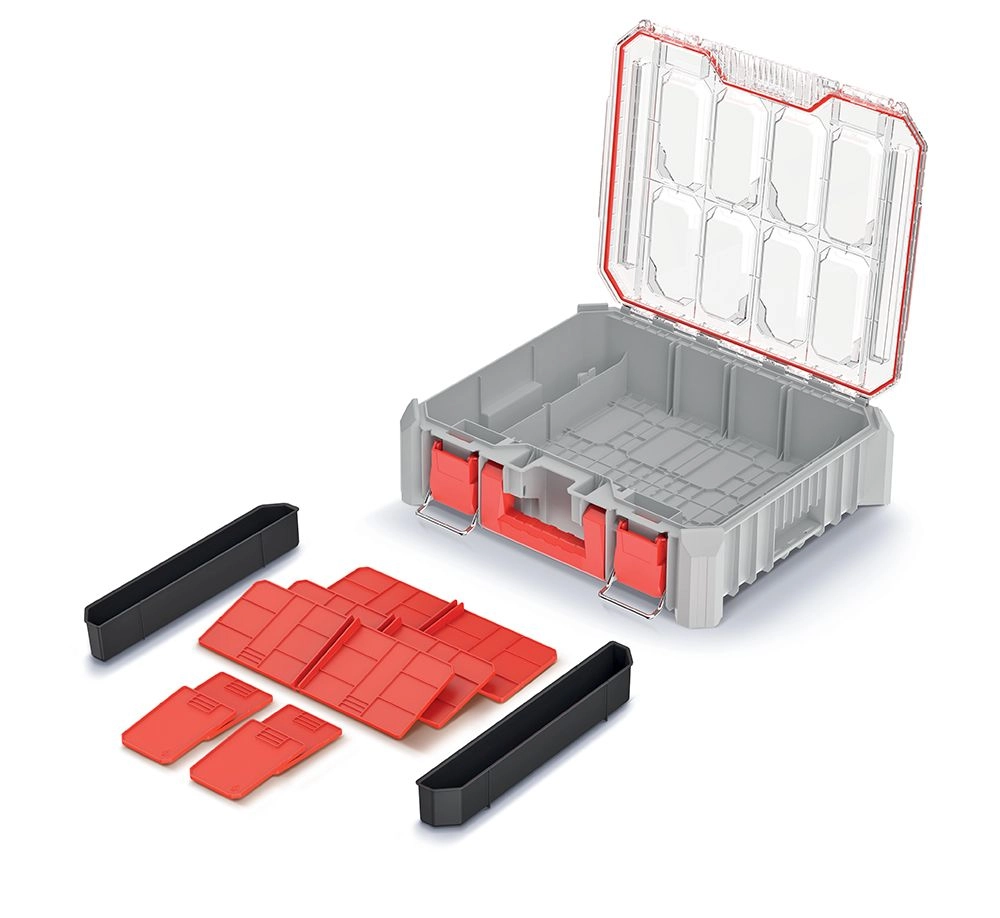 Dvě vyjímatelné nádobky a sedm odnímatelných přepážek poskytují flexibilní, modulární uspořádání. Pevné těsnění chrání obsah před prachem a vlhkostí, takže organizér je ideální jak do dílny, tak na montáže v terénu. Kovové/pevné západky a robustní madlo zajišťují bezpečné přenášení.