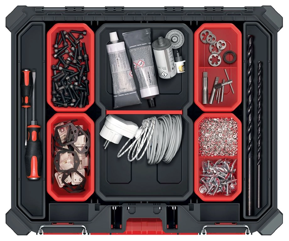 Kufříková konstrukce s 13 vyjímatelnými boxy umožňuje flexibilní uspořádání drobného materiálu, bitů, vrutů či hmoždinek. Prachu- a voděodolné těsnění chrání uložené vybavení na stavbě i v dílně. Modulární a stohovatelný systém šetří místo a usnadňuje transport více organizérů najednou.