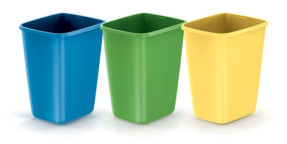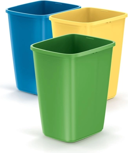 Praktický set tří třídicích košů o objemu 3×9 l z odolného plastu pro snadné a hygienické třídění odpadu i v malých prostorech. Barevné rozlišení (modrá, zelená, žlutá) zajišťuje přehledné třídění, otevřený design bez víka umožňuje rychlé vkládání i vysypávání a hladký povrch se snadno čistí. Kompaktní rozměry se hodí do kuchyní, kanceláří i dílen.