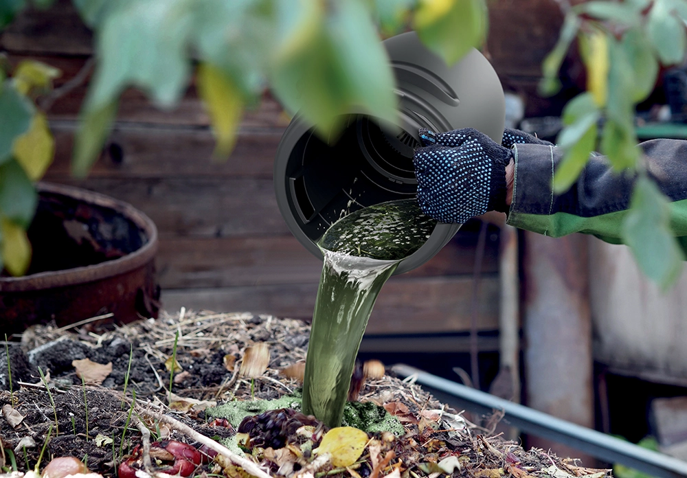 COMBIOLIQ je kompaktní řešení pro výrobu tekutého hnojiva z běžných zahradních a lučních rostlin. Stačí naplnit vnitřní sítko natrhanou zelení, zalít dešťovou vodou a nechat 2–4 týdny fermentovat. Průběžné míchání a vhodná teplota urychlí proces a vznikne živinami nabitý extrakt, který podporuje růst, kvetení i vitalitu rostlin a zlepšuje strukturu půdy.
