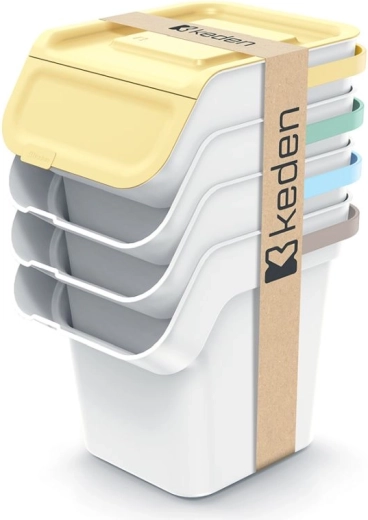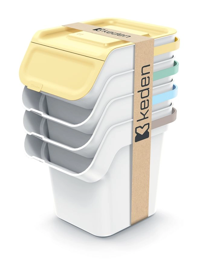 Praktická sada čtyř košů o objemu 4×20 l pro efektivní třídění odpadu v domácnosti. Každý koš má víko s vyměnitelným uhlíkovým filtrem pro snížení zápachu, kompaktní rozměry pro úsporu místa a možnost stohování pro flexibilní umístění v kuchyni, spíži či kanceláři.