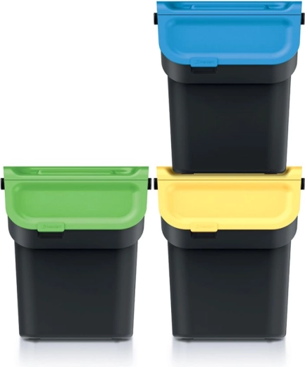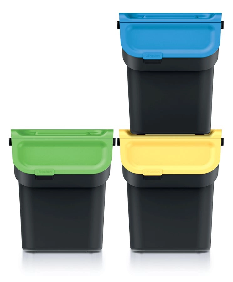 Praktická sada tří košů o objemu 3×20 l pro efektivní třídění odpadu v domácnosti i kanceláři. Díky modulární konstrukci je lze snadno stohovat nebo umístit vedle sebe. Každý koš má víko s filtrem z aktivního uhlí pro potlačení pachů, odolné plastové provedení v recyklované černi a pohodlnou rukojeť pro snadné přenášení.