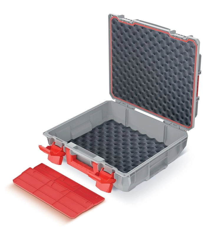 Díky krytí IP55 odolá prachu a stříkající vodě, zatímco ABS zámky pevně drží víko uzavřené. Dvě vyjímatelné přepážky umožňují konfigurovat vnitřní prostor podle aktuálních potřeb a integrovaná rukojeť usnadňuje manipulaci i při plném zatížení do 25 kg. Kompaktní rozměry 45 × 38 × 13,5 cm se snadno vejdou do dílny, auta i servisu.