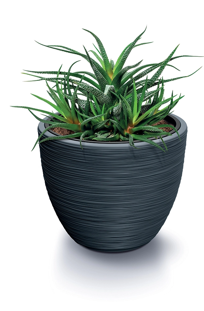 Jemná světle šedá s horizontálním žebrováním ladí s minimalistickými i klasickými interiéry a dodá rostlinám stylový rám.