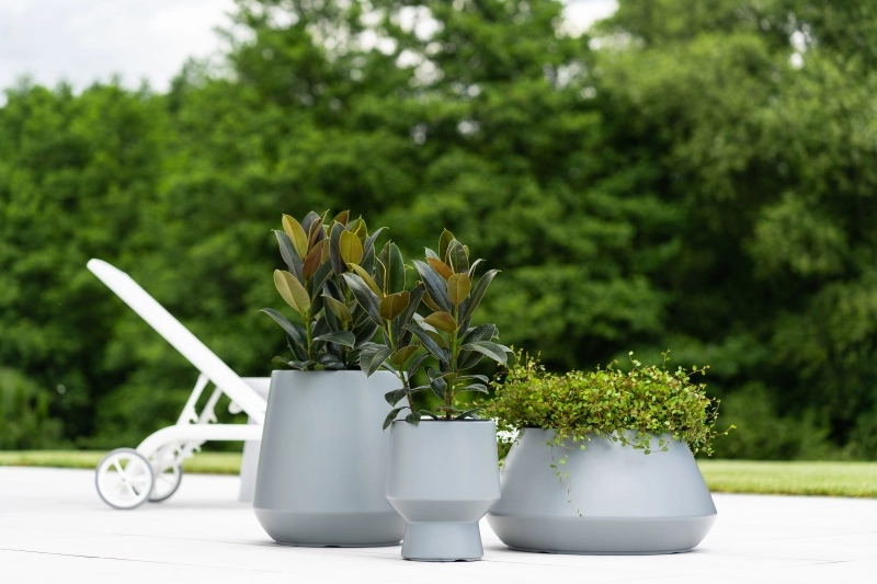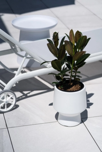 Moderní tvar a matná světle šedá barva krásně ladí s venkovním posezením i zelení. Skvěle se hodí na patio, balkon nebo předzahrádku.