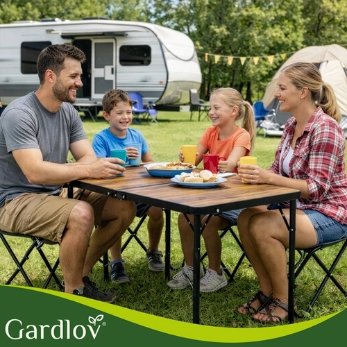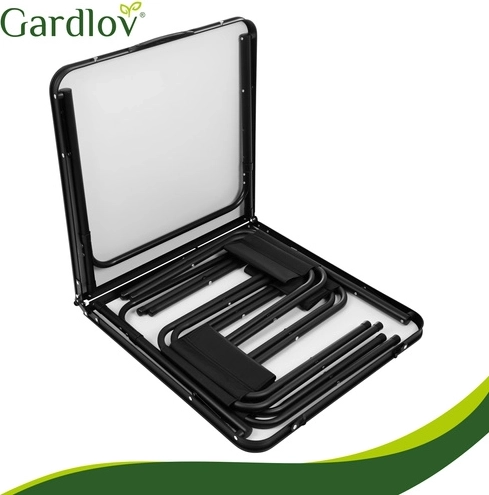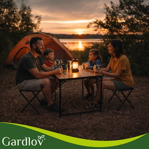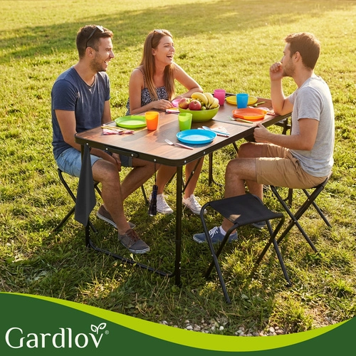 Praktický skládací set GARDLOV kombinuje zahradní stůl s nastavitelnou výškou a 4 skládací stoličky v jednom. Po složení vznikne kompaktní kufřík s madlem, který snadno přenesete i uložíte. Odolná konstrukce, stabilní kovové rámy a protiskluzové koncovky zajišťují pohodlné stolování na zahradě, terase i při kempování.