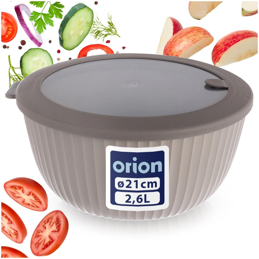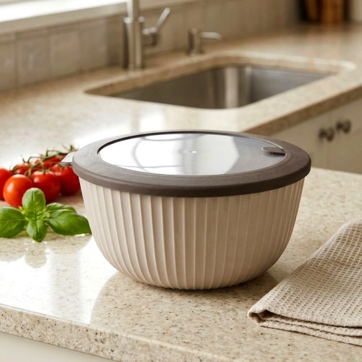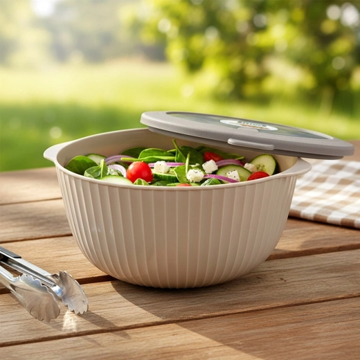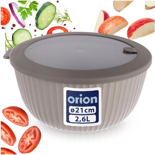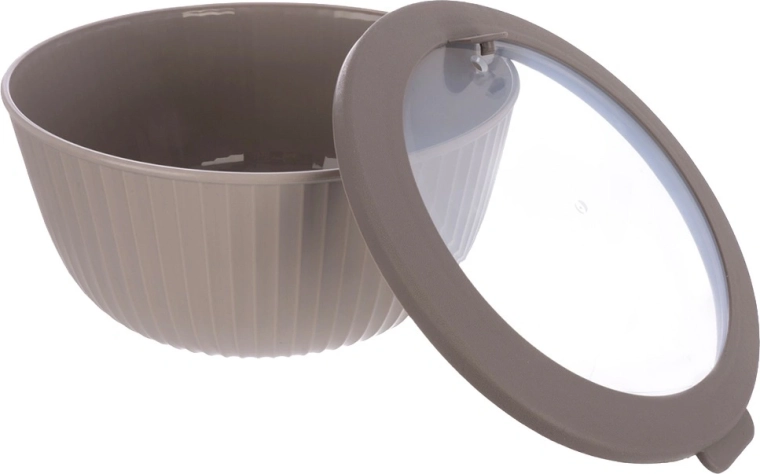Praktická kuchyňská mísa s víkem o objemu 2,5 l je ideální pro míchání, servírování salátů, uchovávání i ohřívání v mikrovlnce. Má průhledné víko s ventilem, těsnicí gumový kroužek a je vyrobena z BPA free materiálu, odolného od -25 °C do +95 °C. Snadno se udržuje a lze ji mýt v myčce.