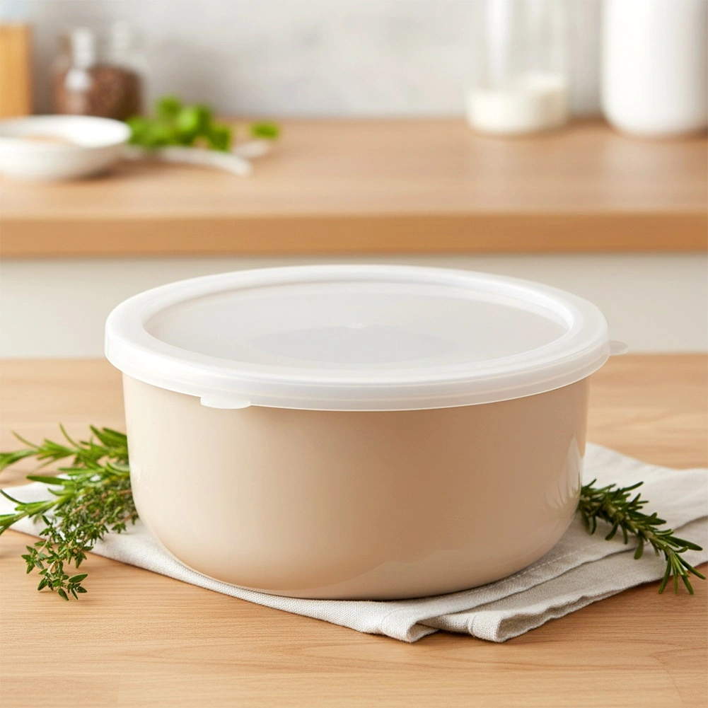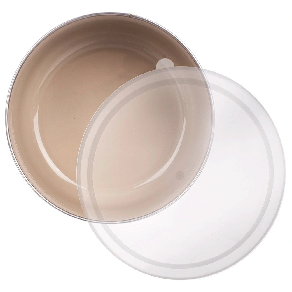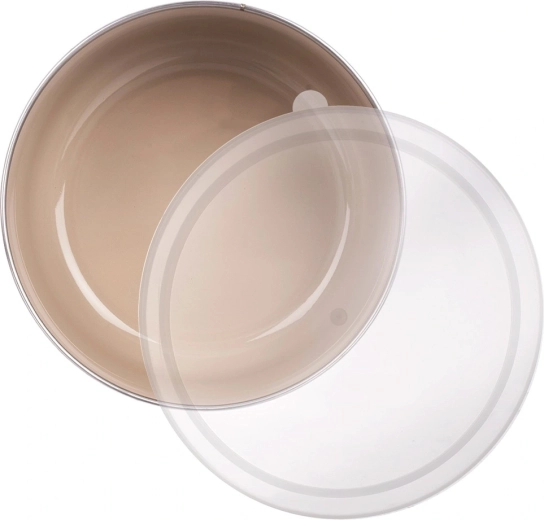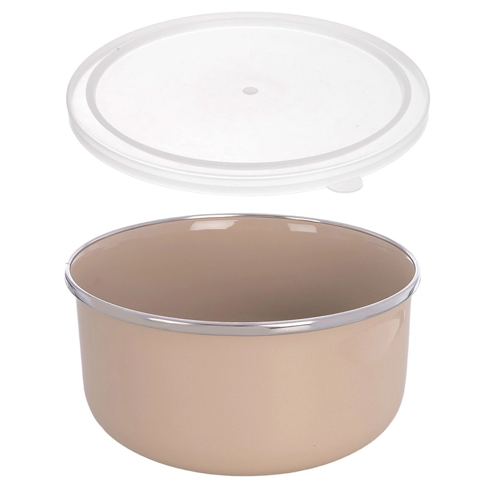 Praktická smaltovaná miska s víkem o objemu 1,3 l ve stylové béžové barvě. Ideální na uchovávání, servírování i přenos jídel, s možností ohřevu na sporáku i v troubě. Průhledné víko zajistí těsné uzavření a přehled o obsahu, nerezový okraj dodává odolnost a elegantní vzhled.
