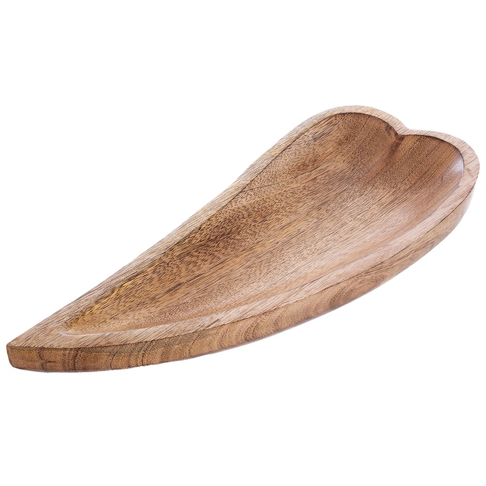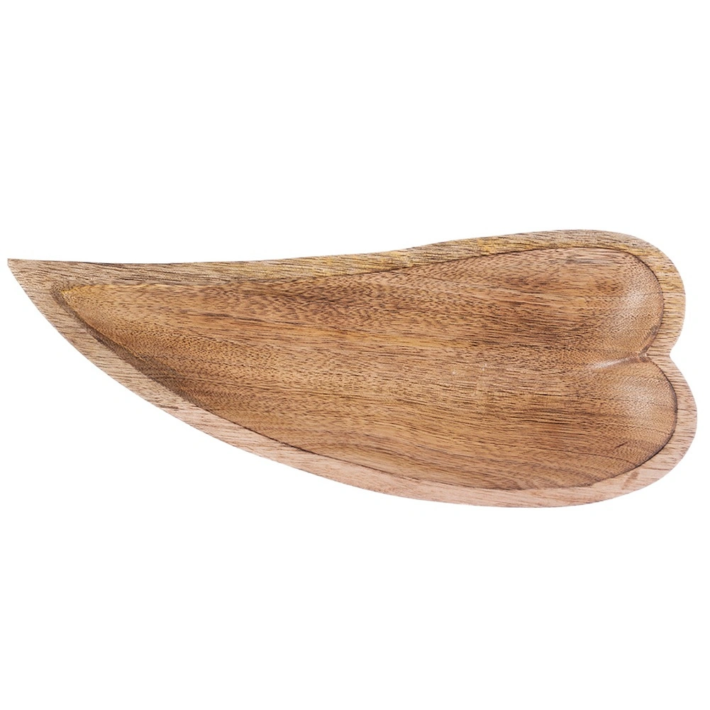 Stylový servírovací talíř z přírodního mangového dřeva v elegantním listovém/ srdcovém tvaru skvěle poslouží pro podávání snacků, dezertů i předkrmů. Díky rozměrům 38 × 15,5 × 3,5 cm je ideální na ořechy, sušenky či ovoce a zároveň ozdobí každý stůl. Přírodní dřevo mango, odolné zpracování a jedinečná kresba dřeva dodají vašemu stolování rustikální i moderní šmrnc.