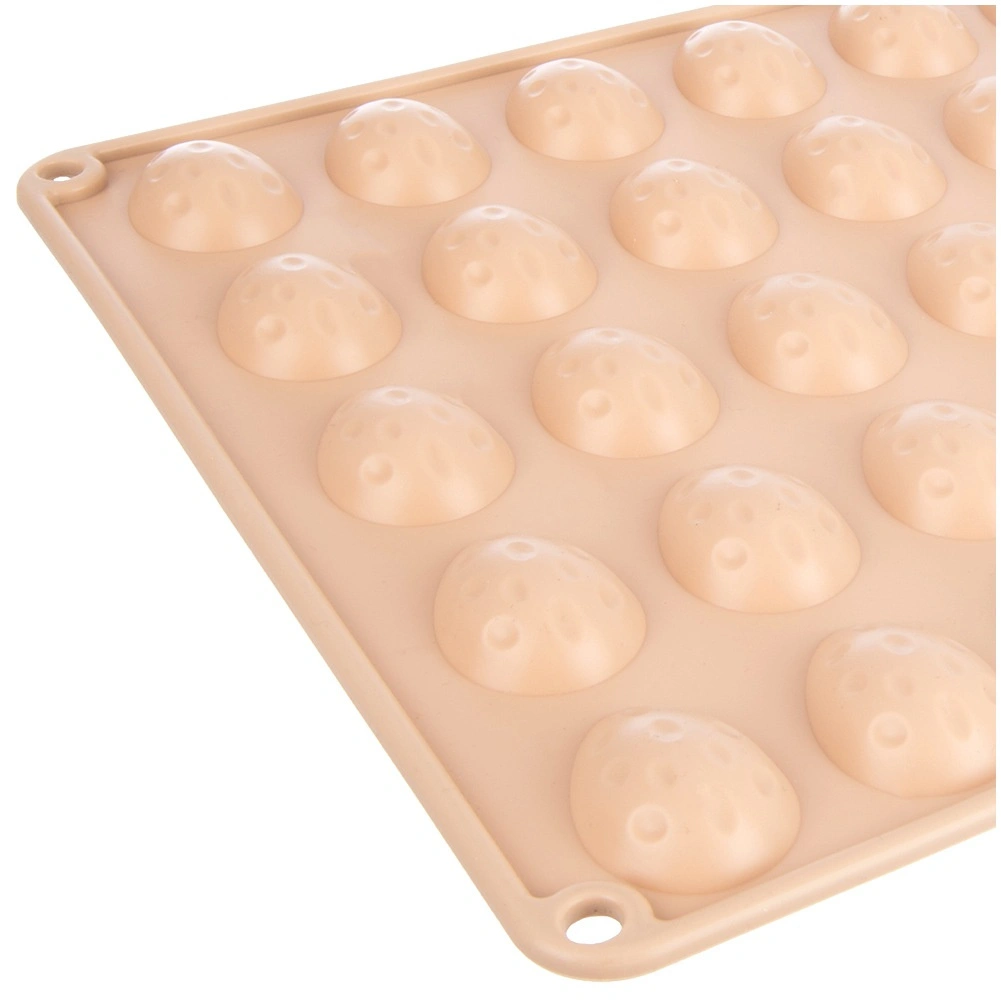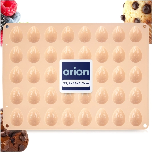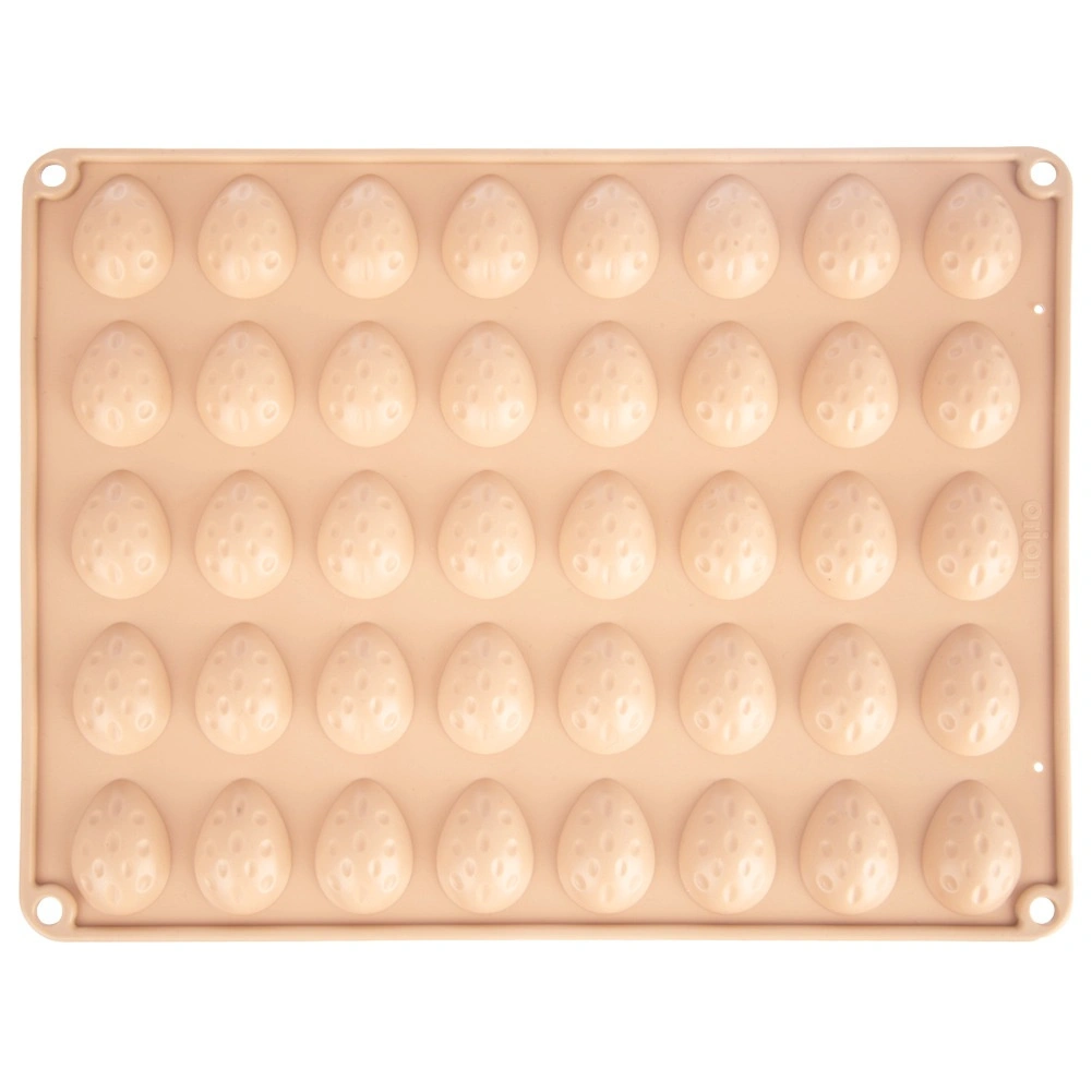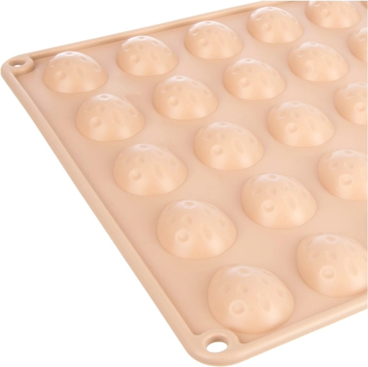 Vícedutinová forma s rozměry 33,5 × 26 × 1,5 cm pojme čtyřicet polokulí ve tvaru vajíček o velikosti cca 4 × 3 cm – ideální pro pralinky, čokoládky i mini sušenky.