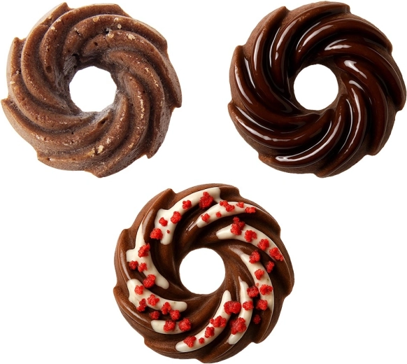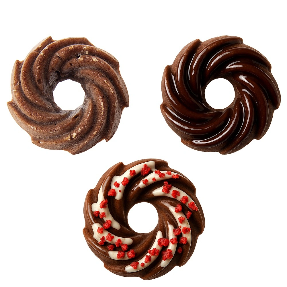 Každá forma má středový výstupek, který zajišťuje lepší cirkulaci tepla a atraktivní věncový tvar. Ideální pro muffiny, mini bábovky i donuty.