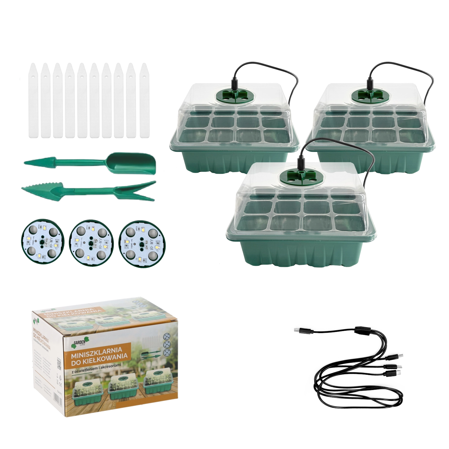 Balíček je navržen tak, aby byl připraven k použití: kromě pěstitelských misek získáte také zahradnické pomůcky pro přesazování a nakličování a etikety pro jasné označení odrůd. Miniskleníky se hodí na parapet, do regálu i do dílny a pomohou s předpěstováním zeleniny, bylinek i květin.
