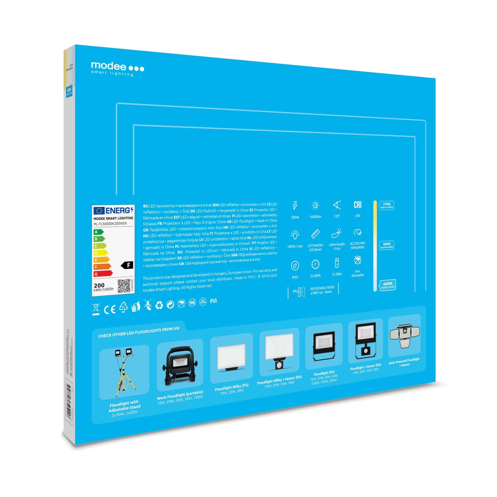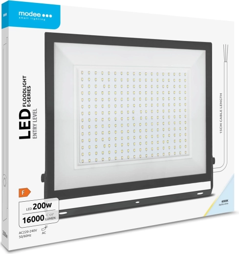 Výkonný LED reflektor Modee E‑series Slim 200 W nabízí světelný tok 16000 lm, široký úhel svitu 120° a odolnost IP65. Díky barvě světla studená bílá 6000 K skvěle nasvítí vjezdy, dvory, terasy i průmyslové prostory při nízké spotřebě energie.