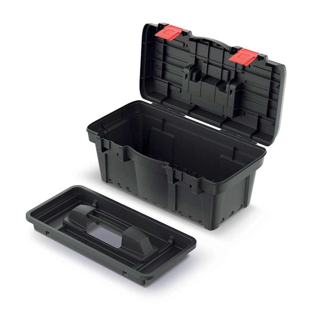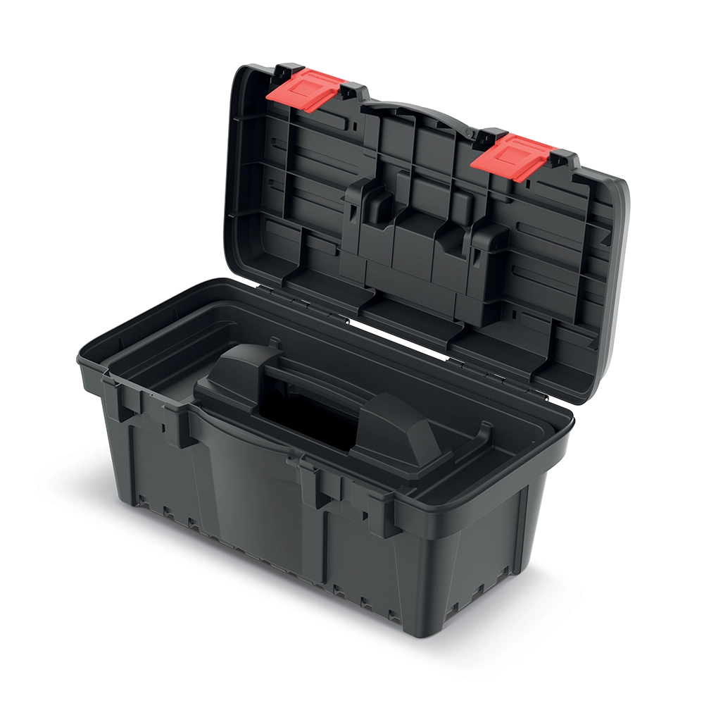 Integrovaná vyjímatelná přihrádka nabízí rychlý přístup k menším součástkám, zatímco robustní plast, zesílené rohy a pevné ABS západky chrání obsah během přepravy. Ergonomická rukojeť usnadňuje manipulaci a jistý úchop i při plném zatížení do 12 kg.