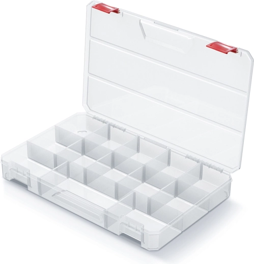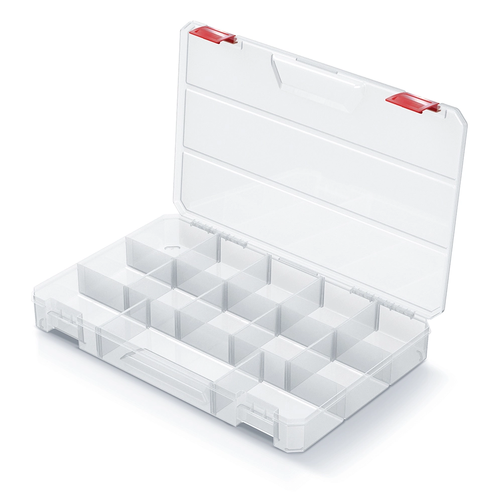 Díky 11 přihrádkám a 8 vyjímatelným modulům snadno přizpůsobíte vnitřní uspořádání aktuálním potřebám. Lehká, ale odolná konstrukce z plastu společně s pevnými uzávěry zajistí bezpečné uložení a přenášení drobných dílů.