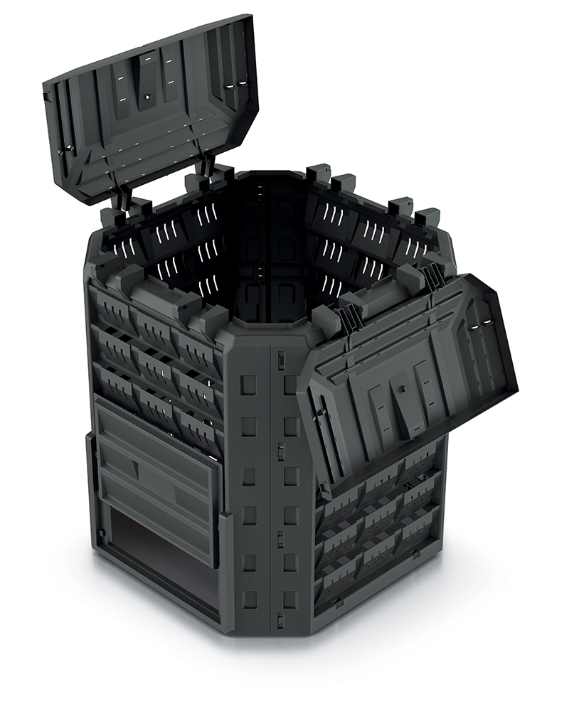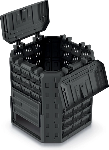 Horní víko s možností uzamčení chrání obsah před větrem a zvířaty, velký otvor pak usnadňuje každodenní vkládání odpadu. Po celém obvodu jsou umístěny ventilační otvory pro správnou cirkulaci vzduchu a udržení optimální vlhkosti, což urychluje proces kompostování. Hotový kompost pohodlně odeberete přes dvě spodní posuvná dvířka. Čtyři zemní kolíky pevně ukotví kompostér k podkladu pro vyšší stabilitu.