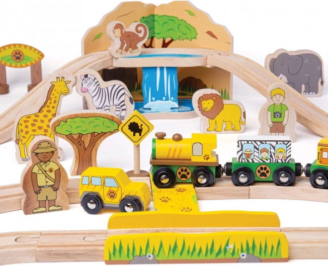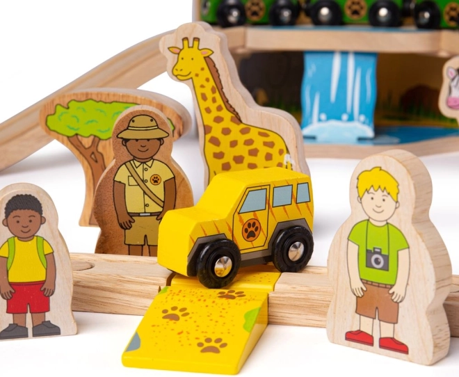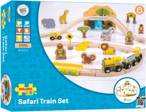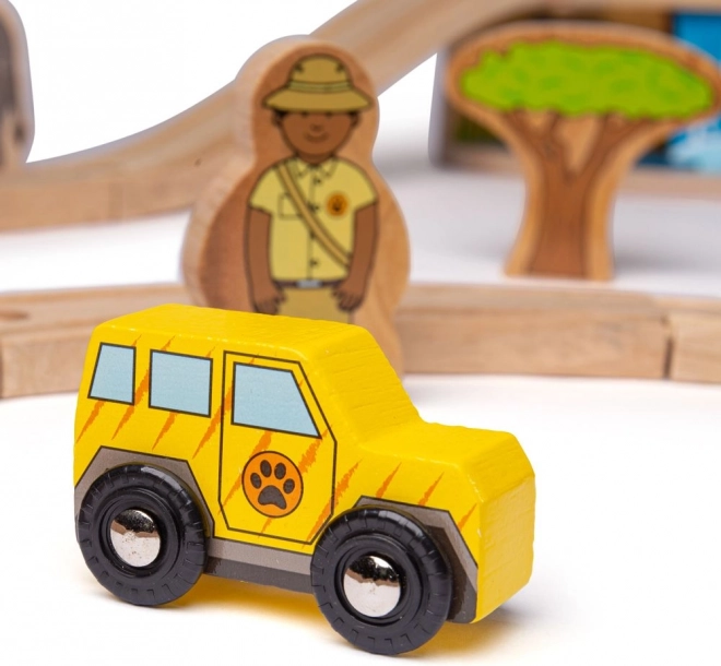 Objevujte svět safari s barevnou a bytelnou dřevěnou vláčkodráhou, která potěší děti od 3 let. Set zahrnuje zvířátka jako slon, zebra či opice, stromky, značky a most, po kterém projíždí žlutá lokomotiva se dvěma vagónky. Díky magnetickým spojkám je hra intuitivní a rozšiřitelná.