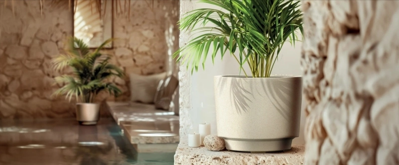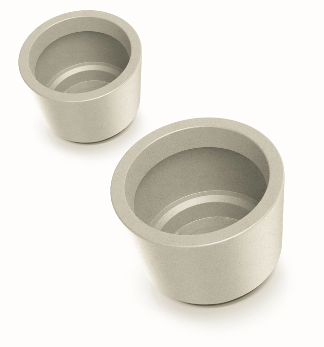 Jednoduché válcovité linie a granitově šedé provedení snadno doplní interiér i venkovní prostor a nechají vyniknout samotné rostliny.